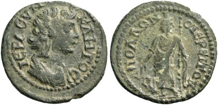 | RPC 3043 | Tiberius, AE18 of Apollonoshieron, Lydia. 14-37 AD. TIBEΡIOC KAICAΡ, laureate head right / AΠOΛΛΩNIEΡEITΩN, Apollo, standing facing, holding patera and resting hand on lyre. RPC 3043; SNG Righetti 1007; Mionnet IV, 53; Paris 73 and 73A; BMC 7; Plankenhorn 943; Waddington 4874; SNG Cop 31; SNG Munich 43; Winterthur 3692; SNG von Aulock 2907; Leypold I, 894; GRPC Lydia 21. | Text | Image |