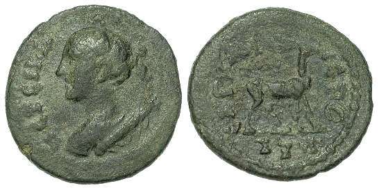 | RPC 2388 | Agrippina II, AE18 of Hierocaesarea, Lydia. 54-59. Magistrate Kapitonos. AΓΡIΠΠINAN ΘEAN ΣEBAΣTHN, draped bust right / EΠI KAΠITΩNOC IEΡOKAICAΡEΩN, Artemis standing right, placing arrow into her bow, stag standing right at her side. RPC I 2388; SNG von Aulock 2959; Paris 446-447; Waddington 5003; GRPC Lydia 72. | Text | Image |