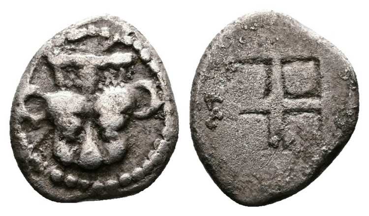 | SNG ANS 17 | Akanthos, Macedonia. Ca. 525-470 BC. AR Tetrobol (2.34 gm). Forepart of bull left, head reverted / Quadripartite incuse square. | Text | Image | Text | Image | Text | Image |