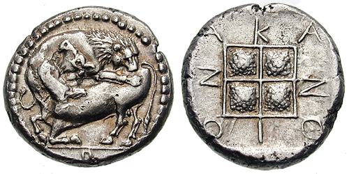 | SNG ANS 6 | Akanthos, Macedonia. Ca. 500-480 BC. AR Tetradrachm. Lion right, attacking bull kneeling to left; [floret in exergue] / Quadripartite incuse square. | Text | Image | |