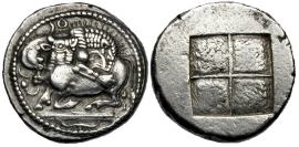 Akanthos, along with other Thraco-Macedonian cities and tribes, began striking impressive sized silver coins at the end of the 6th century BC.