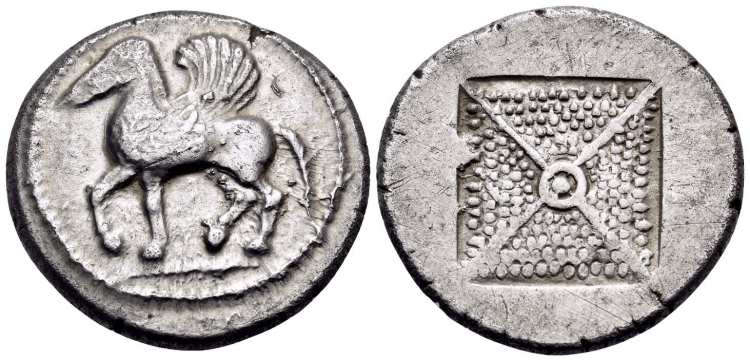 | Dewing 1081 | Argilos, Macedonia. AR stater, ca 495-470 BC. 26 mm. 12.74 g. Pegasos with curved wing, walking left. / Quadripartite incuse square, with central dotted circle and stippled surfaces. Dewing 1081; Traité II 1212. | Text | Image |