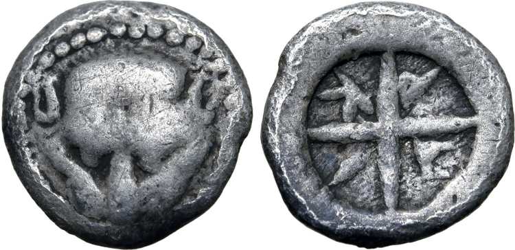 | Liampi 130 | Argilos, Macedonia. AR hemiobol or 1/48 stater, ca 460-455 BC. 9 mm. 0.42 g. Lion's head facing. / A-Ρ-K-I within circular incuse divided wheel-like into four segments. Liampi 130; Hoover HGC 488. | Text | Image |