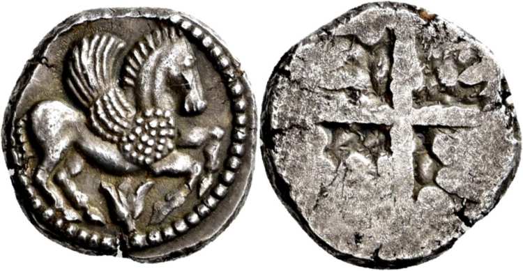 | Liampi p15cf | Argilos, Macedonia AR Tetrobol. ca 510-480 BC. Forepart of Pegasos left; three pellets around / Quadripartite incuse square. Cf. Liampi, Argilos p. 15, d (Pegasos right). | Text | Image |