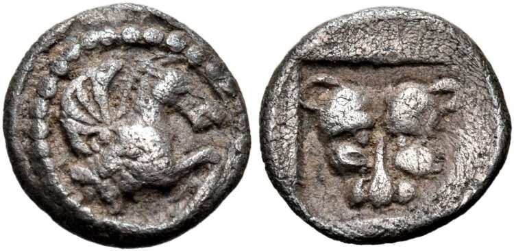 | Liampi 85b | Argilos, Macedonia, AR 1/32 stater. ca 495-477 BC. 8 mm, 0.3 g. Forepart of Pegasos right. / Lion's head facing within incuse square. HGC 3, 482; Liampi 85b; (this coin). | Text | Image |