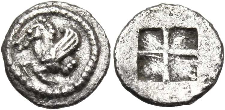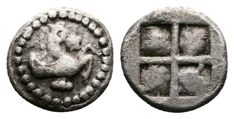 | Liampi 88 | Argilos, Macedonia. AR hemiobol, ca 495-477 BC. 8.1 mm. 0,36 g. Forepart of Pegasos right. / Quadripartite incuse square. HGC 3 481; SNG ANS 763; Liampi 88. | Text | Image |