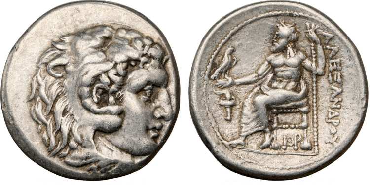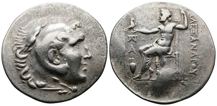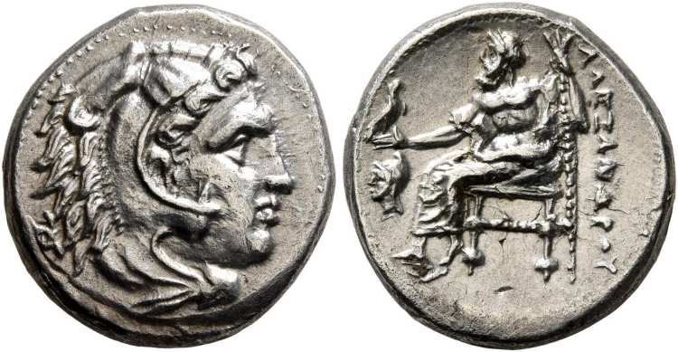 | Price 123 | Alexander III, AR tetradrachm, Macedonia mint. 320-317 BC. 25 mm, 17.13 g. Head of Herakles right, wearing lionskin headdress / BAΣIΛEΩΣ AΛEΞANΔΡOY to left and right of Zeus seated left, holding eagle and sceptre. Upright crescent in left field, Π beneath chair. Price 123; Mueller 261; Newell Reattribution 51a. | Text | ![]() |