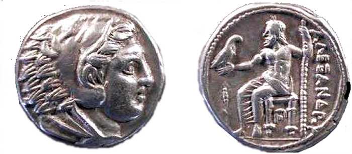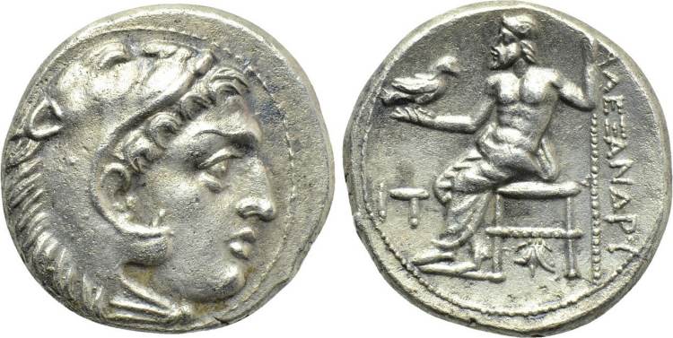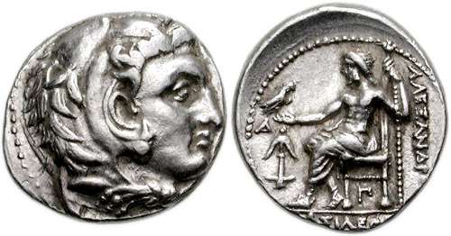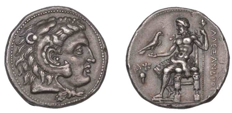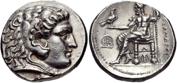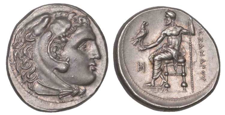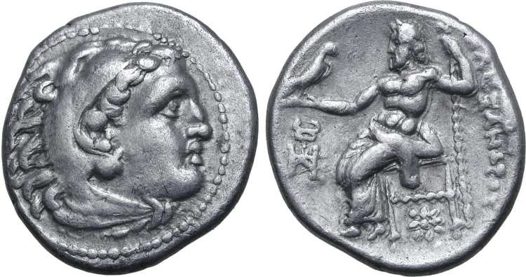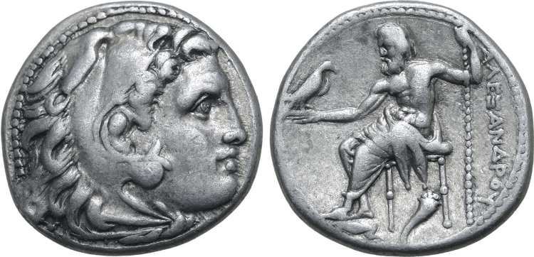 | Price 4004 | Alexander III AR Tetradrachm. Uncertain Eastern mint, 325-300 BC. Head of Herakles right, wearing lionskin headdress / AΛEΞANΔΡOY, Zeus seated left, holding eagle and sceptre, no symbols. | Text | ![]() |