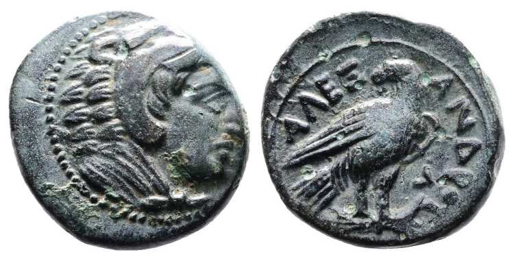 | SNG Cop 1021 | Alexander III AE16. Herakles head right / AΛEΞANΔΡOY, eagle standing right on thunderbolt, head turned back. | Text | ![]() |