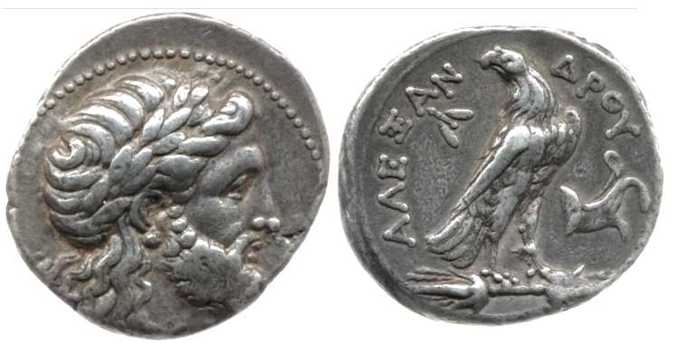 | Cavalla hoard 15 | Alexander III, AR tetradrachm, Tarsos, posthumous issue, struck under Antigonos I Monophthalmos. 316-301 BC. 26 mm, 17.05 g. Head of Herakles right, wearing lionskin headdress. / AΛEΞANΔΡOY, Zeus seated left, right leg drawn back, holding eagle and sceptre. ME monogram retrograde in left field, ΣΡE monogram beneath chair. Cavalla hoard 15 (in ANS MN 26). | Text | ![]() |