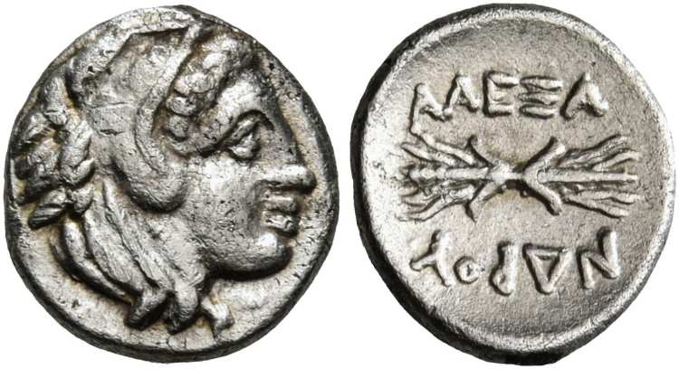 | CNG 191734 | Alexander III, AR drachm, Chios? Asia Minor uncertain. ca 290-270 BC. 20mm, 4.12g. Head of Herakles right, wearing lionskin / AΛEΞANΔΡOY, Zeus seated left, right leg drawn back, holding eagle and sceptre. Triskeles in left field. Price –; Newell -. Unpublished fieldmark. | Text | ![]() |