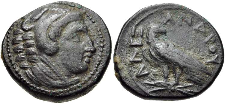| Price 27 | Alexander III AE16.5, Amphipolis mint, struck under Antipater, 332-326 BC. 2.95 g. Head of Herakles right, wearing lionskin headdress. / AΛEΞANΔΡOY, eagle standing right on thunderbolt, head left, ivy leaf in lower right field. Price 27. | Text | ![]() |
