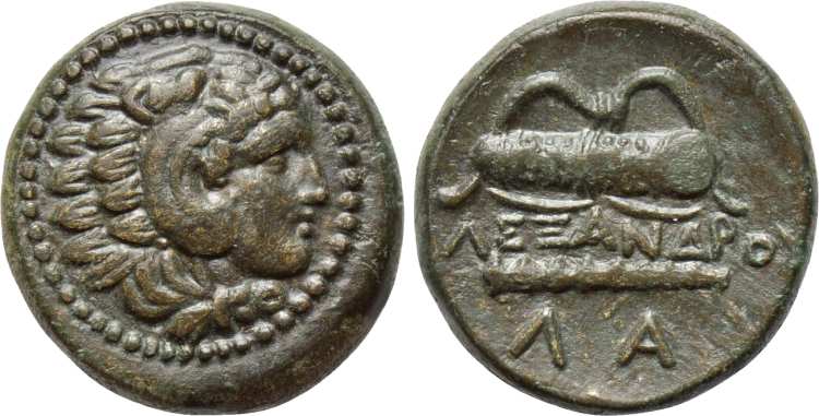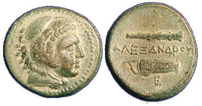 | SNG Cop 1034 | Alexander III AE. AΛEΞANΔΡOY between club above and bowcase and bow below. | Text | ![]() |