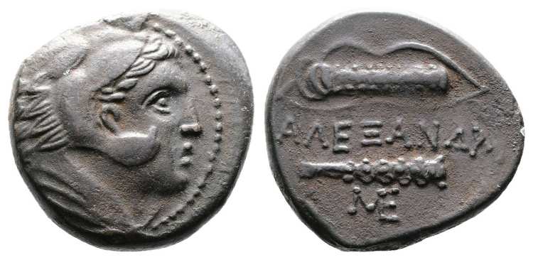 | TLA 102255 | Alexander III, AE17, Mint in Macedonia. 336-323 BC. Head of Herakles right, wearing lionskin headdress. / AΛEΞANΔΡOY, bow case right above, club with handle left below, dolphin left in exergue. Timeline Auctions 102255. Unpublished var. of Price 323; Drama hoard 91; Mueller 541, SNG Cop. 1057; SNG Munich 851; Alpha Bank Portolos 1077 (all with club above and bowcase beneath the name). | Text | ![]() |