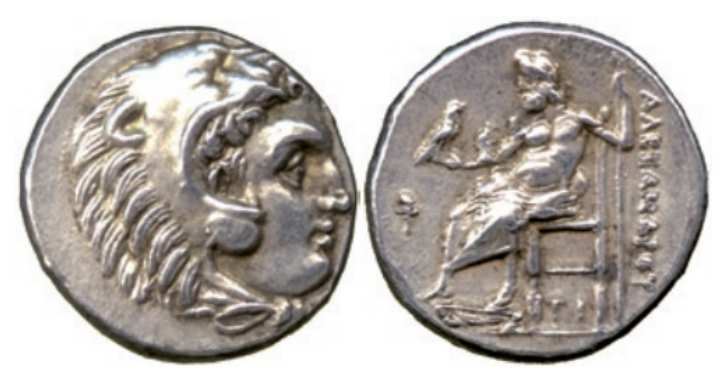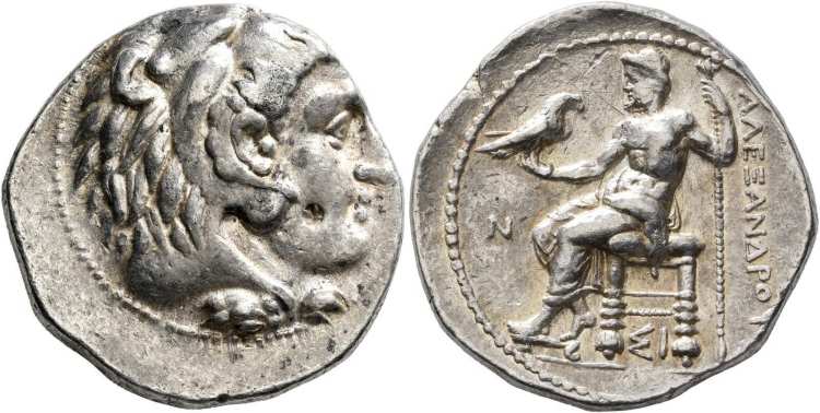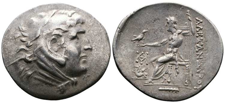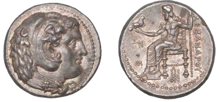| Price 3976a | Alexander III. 336-323 BC. AR Tetradrachm. Head of Herakles right, clad in lionskin headdress / Zeus seated left, thunderbolt in left field, DI beneath chair. | Text | ![]() |