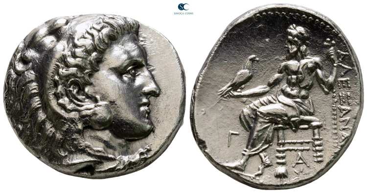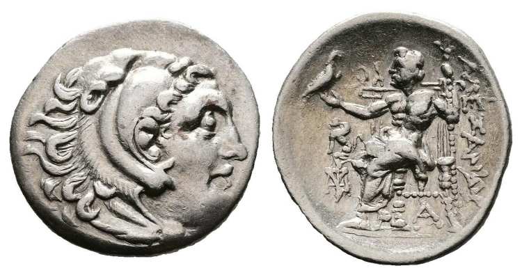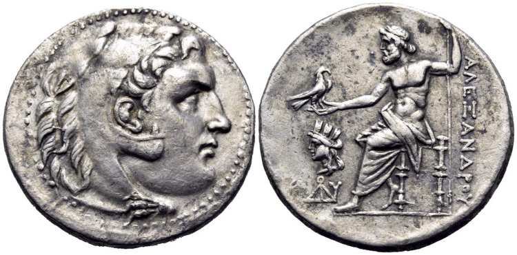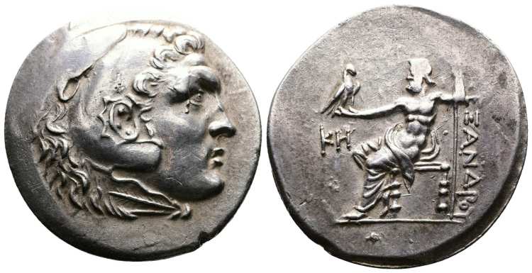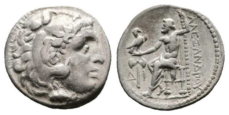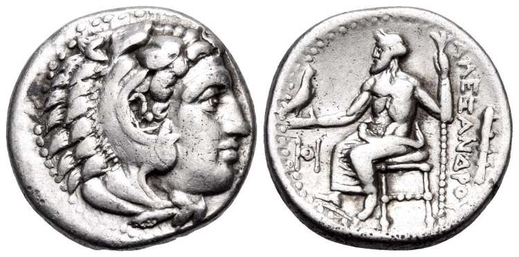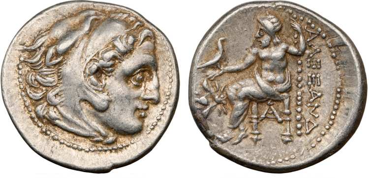 | Price 3846 | Alexander III, AR tetradrachm. Susa mint, posthumous issue, 322–320 BC. 26 mm, 17.07 g. Head of Herakles right, wearing lionskin headdress. / BAΣIΛEΩΣ AΛEΞANΔΡOY, Zeus seated left, right leg drawn back, holding eagle and sceptre. MY monogram in left field, ΛA beneath the chair. Price 3846; Mueller 831. | Text | ![]() |