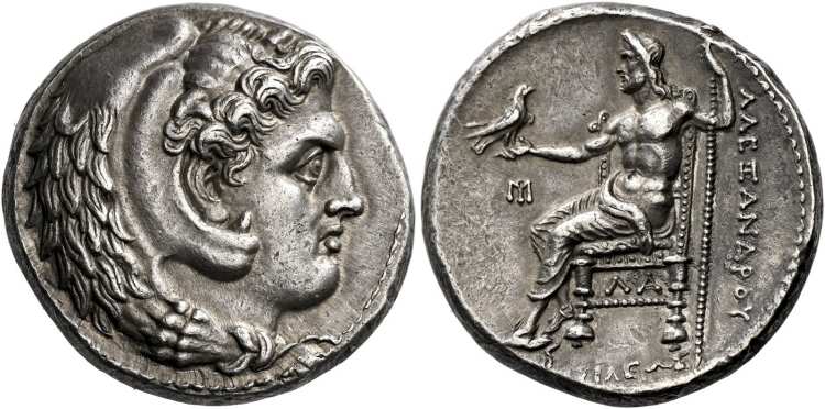 | Price 3829 | Alexander III AR Tetradrachm. Susa, 325-320 BC. Head of Herakles right, in lionskin headdress / BAΣIΛEΩΣ AΛEΞANΔΡOY, Zeus seated left, holding eagle on extended arm, legs crossed, MAΡ monogram in left field, ΠΛTΡ monogram beneath chair. Price 3829. | Text | ![]() |