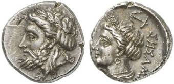 | RecGen 2 | Sesamos, Paphlagonia, AR diobol or hemidrachm, 14 mm, 1.65 g. 400-300 BC. Laureate head of Zeus left. / ΣHΣAMH, head of Demeter left, wreathed with corn, wearing earring and necklace. RecGen 2; Waddington 163; Paris F1156; Sear SG 3684. | Text | Image |