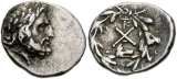| Lacedaemon Clerk 321 | Achaean League, Lacedaemon. Circa 192 BC. AR Hemidrachm. Laureate head of Zeus Amarios right / AX monogram, caps of Dioskuri to left and right, I over Λ above, EY below; all within wreath. | Text | ![]() |