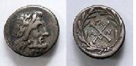 | Messene BMC 118 | Messene AR Hemidrachm. 196-146 BC. Laureate head of Zeus right / AX monogram, O-N to left and right, OP above, M below; all within laurel-wreath. Agrinion 325d-e. | Text | ![]() |