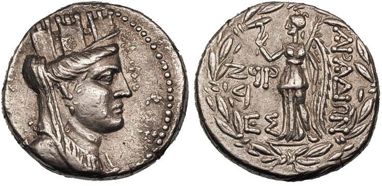 BMC 220 | Arados, Phoenicia. AR tetradrachm, Dated local year 167, 92-92 BC. 27 mm, 14.87 g. Turreted, veiled and draped bust of Tyche right. / AΡAΔIΩN, Nike standing left, holding aphlaston and palm branch. ZΞΡ over Phoenician "," over IN in left field, all within wreath. BMC 220; Duyrat 3321-3334; Babelon 1081A; Beyreut 90. | Text | Image |