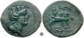 | RPC 4303 cmk Sear 6043 | Orthosia, Phoenicia, AE18.8, time of Augustus, 1st C. BC. Turreted and draped bust of Tyche right, countermark of three concentric circles or incuse shield (Howgego 486) / OΡΘΩCIEΩN, Kronos? holding harpe, in car drawn by two winged panthers, (date above). Sear Greek 6043; BMC 1; RPC 4503-4505. | Text | Image |