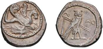 | Betlyon 37 | Phoenicia, Tyre, Uzzimilk. Circa 347-332 BC. AR Didrachm. Dated year 15 (332 BC). Crowned & bearded deity riding right on winged hippocamp, holding reins & bow; two-line zig-zag wave & dolphin right below / Owl standing right, head facing, crook & flail behind; Phoenician letter Ayin with date to right. | Text | Image |