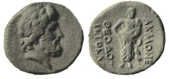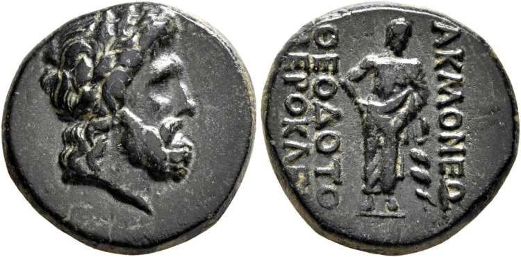 | Weber 6970 | Akmoneia, Phrygia. AE17. Civic issue, 100-1 BC. 2.6 g. Magistrate Theodotos Hierokles. Laureate head of Zeus right, wreathed with oak. / ΘEOΔOTO IEΡOKΛE AKMONEΩN to left and right of Asklepios standing front, leaning on serpent-entwined staff with right hand. Weber 6970-6971; SNG Munich 54; Walcher 2733; Hunter 2; SNG Cop 11; Hoover HGC 650. | Text | Image |