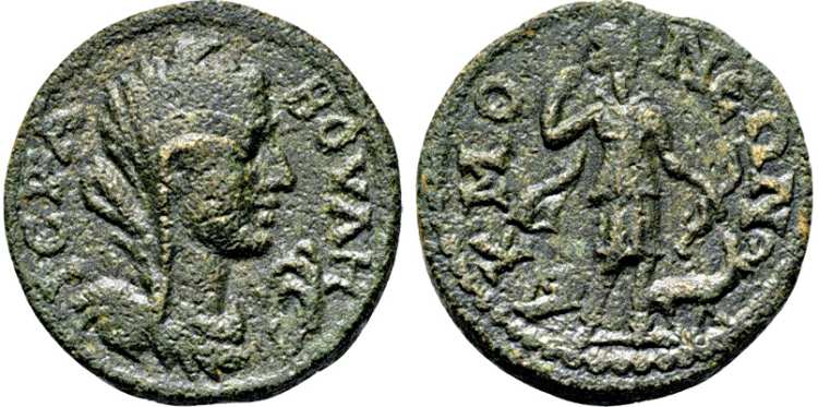 | SNG Tub 3920 | Plautilla, AE19 of Acmoneia, Phrygia. AD 202-205. Magistrate Flabios Priskos. ΠΛAYTIΛΛA CEBACTA (sic), diademed and draped bust right. / EΠI ΦΛ ΠΡICKOY ΓΡA AKMONEΩN, Hades-Serapis seated left, holding sceptre, right hand extended over Kerberos at foot. SNG Tuebingen 3920. | Text | Image |