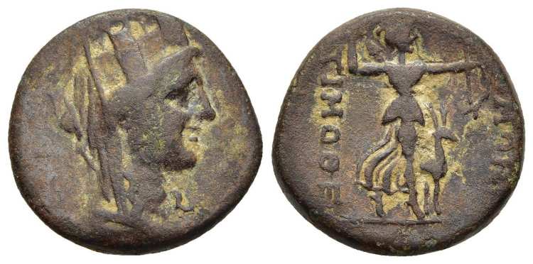 | Imhoof KM 2 | Julia Domna, AE21 of Acmoneia, Phrygia. AD 193-217. 4.71 g. IOYΛIA ΔOM CEBACTH (-TH beneath neckline), draped bust right. / AKMONEΩN, Artemis Ephesia, wearing polos and veil, standing front between two stags. Imhoof KM 2; Winterthur 4019. | Text | Image |