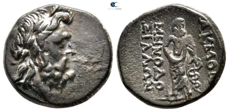 | SNG von Aulock 3366 | Akmoneia, Phrygia, AE18 civic issue. 100-1 BC. Magistrates Menodotos and Sillon. 3.95 g. Bearded head of Zeus right, wreathed with oak. / AKMONE MHNOΔO ΣIΛΛΩN to right and left of Asklepios standing front, leaning on serpent-entwined staff. SNG von Aulock 3366; SNG Munich 56; SNG Tuebingen 3908-3910; SNG Cop 15; Walcher 2732. | Text | Image |