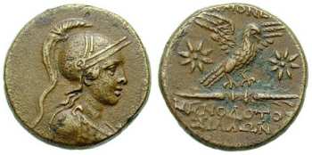 | BMC 15 | Akmoneia, Phrygia. ca 133-48 BC. AE 23mm. Bust of Athena right, in high-crested Corinthian helmet and aegis / AKMONEΩN MHNOΔOTOΣ ΣIΛΛΩN, eagle alighting from thunderbolt, flanked by stars.
