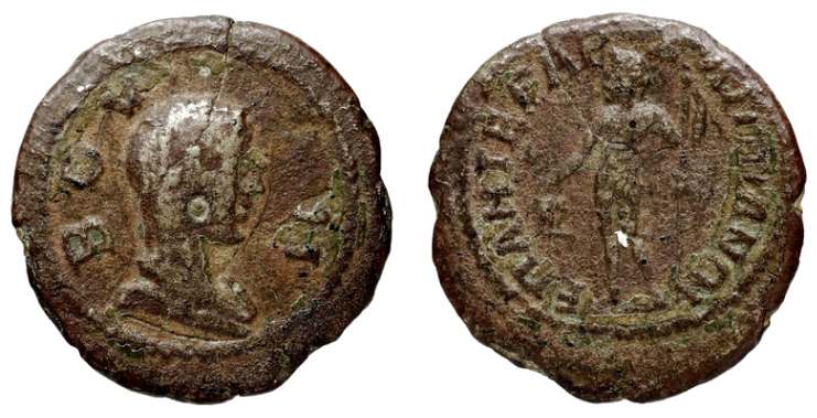 | Waddington 5741 | Geta AE23 of Appia, Phrygia. AD 209-212. Magistrate L. Aur. Quintianos. 8.48 g. Π CEΠT ΓETAC AY CE, laureate, draped and cuirassed bust right. / EΠ Λ AYΡ KYNTIANOY ΓΡA AΠΠIANΩN, Zeus seated left, holding patera and sceptre. Waddington 5741; Paris 558; Aulock Phrygien 1 198; Emeç coll. 707. | Text | Image |