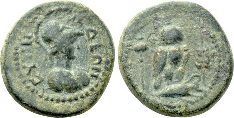 | RPC 3182 | Synnada, Phrygia, AE14, 2.9mm. semi-autonomous issue. AD 14-37. Magistrate Valerianus. (from top left), OYAΛEΡIANOY, eagle standing facing, head left, wings spread / (from top left) CYNNAΔEΩN, owl standing right on amphora. RPC 3182; BMC 8. | Text | Image |