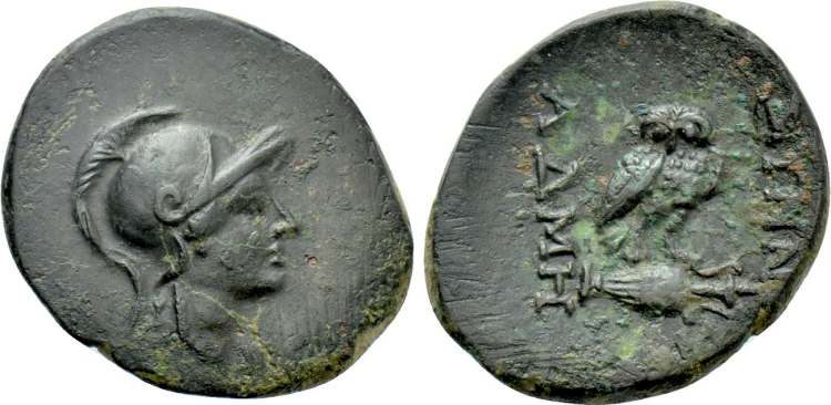 | Mionnet IV, 966 | Synnada, Phrygia. AE17, civic issue. 133-1 BC. Magistrate Admetos. 4.05 g. Helmeted head of Athena right. / ΣYNNA AΔMH, owl standing right, head facing, on overturned amphora. Mionnet IV, 966; SNG Cop 709; SNG Munich 462. | Text | Image |