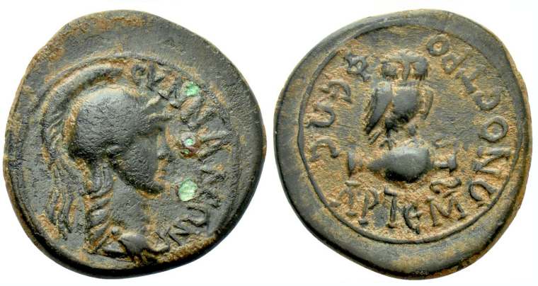 | RPC 3189 | Synnada, Phrygia. AE19, semi-autonomous issue, AD 41-54. Magistrate Artemonos Tropheos. 4.13 g. CYNNAΔEΩN, helmeted head of Athena right / AΡTEMΩNOC TΡOΦEΩC, owl standing right on amphora. RPC I 3189 (1-4); Paris 2011-2012; SNG von Aulock 3974; Waddington 6523; Lindgren III 620. | Text | Image |