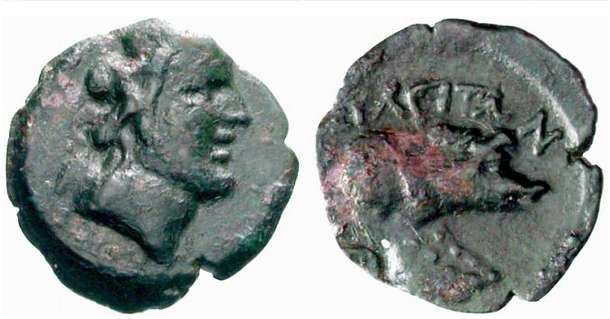 | Aulock Pisis. II 760 | Keraitai, Pisidia. AE15. 40-32 BC. 2.19 g. Shield decorated with a caduceus. / KEΡA, boar's head right. Aulock Pisidien II 760; Paris 299B; SNG France 3, 1422 corr (caduceus faint and omitted); SNG Turkey 6.1, 1386-1388. | Text | Image |