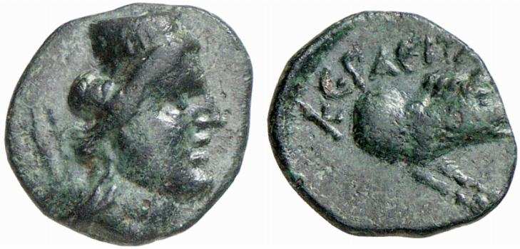 | SNG vA 5055 | Keraitai, Pisidia. AE 13.9mm, 2.6 g. ca 70-40 BC. Laureate head of Artemis right, quiver behind shoulder / KE-TO downwards to left and right, club.SNG von Aulock 5055; Aulock Pisidien II 731-737; Imhoof KM 3; Paris 300; SNG France 3, 1421; Waddington 3663; SNG Cop 117; SNG Turkey 6.1, 1294. | Text | Image |