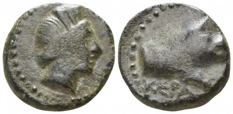 | SNG vA 5053 | Keraitai, Pisidia, AE14. 40-32 BC. 2.66 g. Turreted head of Tyche right. / KEΡA beneath forepart of boar right. SNG von Aulock 5053; v.Aulock Pisidien II 753-754. | Text | Image |