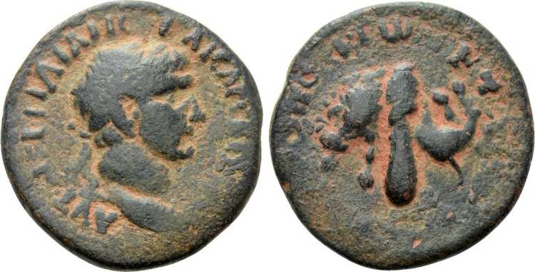 | RPC III 2919 | Trajan, AE23 of Sebastopolis, Pontos. AD 106-107. 7.23 g. Dated AD 109. AYT NEΡ TΡAIANOC KAICAΡ CE ΓE ΔA, laureate head right. / CEBACTOΠOΛITΩN ETOYC ΘΡ, club draped with a lionskin. Imhoof KM 1; Berlin 18316854; Amandry 2-4; RPC III 2919. | Text | Image |