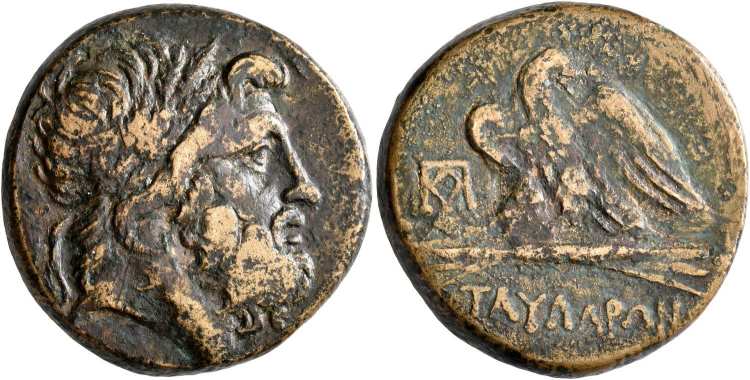 | RecGen 2 | Taulara, Pontos. AE27, ca 100-85 BC. 19.58 g. Wreathed head of Zeus right. / TAYΛAΡΩN, eagle standing left on thunderbolt, head right, wings spread. ΠΛY monogram in left field. RecGen 2: Waddington 212; Paris 447-449; SNG Stancomb 725; SNG France 7, 1922-1923; Michailovitch 1389. | Text | Image |