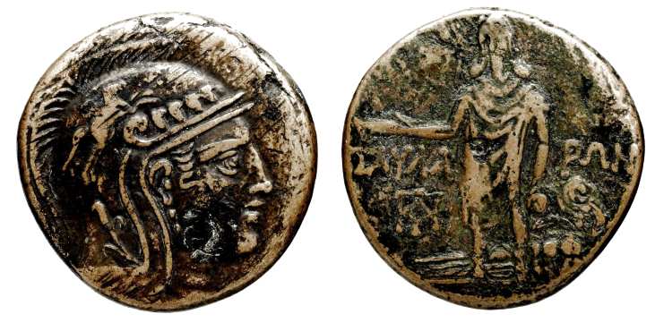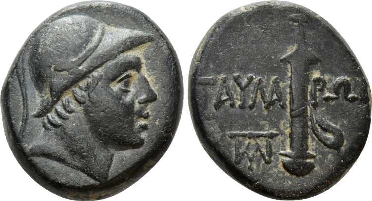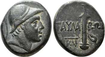 | RecGen 3 | Taulara, Pontos. AE21, ca 100-85 BC. 8.42 g. Helmeted head of Ares right, wearing crested Corinthian helmet. / TAYΛA-ΡΩN, sword in sheath. ΠΛY monogram in left field. RecGen 3: SNG von Aulock 138 and 6781; BMC 1; Paris 450; SNG Cop 225; SNG France 7, 1926-1927; SNG BM Black Sea 1290; Hoover HGC 304. | Text | Image |