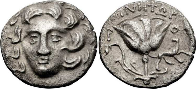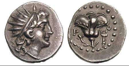 | SNG vA 2794 | Rhodes, Caria, AR hemidrachm. Facing head of Helios, slightly right / Rose, bow in case to left, bud to right. | Text | Image |