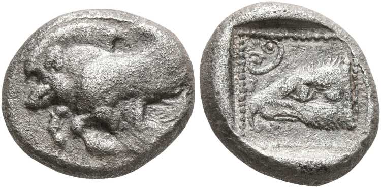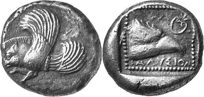 | SNG vA 8185 | Ialysos, Rhodes, Caria. AR stater, ca 510-480 BC. 23 mm, 13.79 g. Forepart of winged boar left. / IAΛYΣION beneath eagle's head right, palmette in upper right corner, all within dotted square in incuse. SNG von Aulock 8185 (this coin); Luynes 2718. | Text | Image |