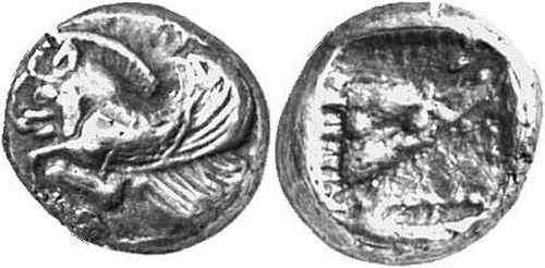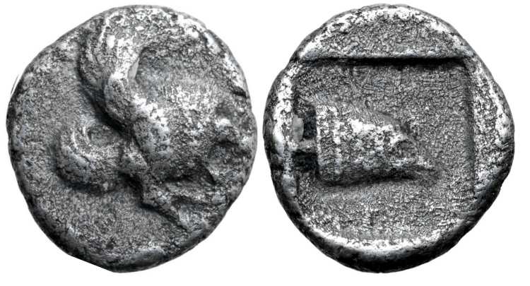 | wwxls AR13206 | Ialysos, Rhodes, Caria. AR trihemiobol, ca 520-480 BC. 11 mm, 1.1 g. Forepart of winged boar right. / Eagle's head right within plain incuse square. Traces of IAΛYΣION below. wwxls AR13206; Savoca 7, 442. | Text | Image |