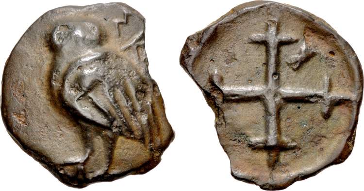 | Sadales SNG BM 314 | Sadales I, King of Scythia. ca 87-58 BC. AE Tetras. 2.03 g. Diademed, male head right / BAΣIΛEΩΣ ΣAΔAΛOY, eagle standing left on thunderbolt. BMC Black Sea 314. | Text | ![]() |