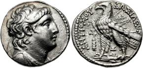 | SNG Is 2089 | Antiochos VII AR Tetradrachm. Tyre mint. Diademed head right / ANTIOXOY BAΣIΛEΩΣ, eagle standing left on prow, palm branch over shoulder, A over ΡE over TYΡ monograms over club in left field, AS over ΓΠΡ in right field, ΓΠΡ monogram between legs. Newell SCT 145; Rogers 87. | Text | Image |