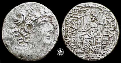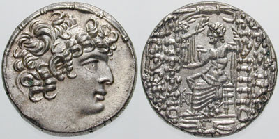 | SNG Is 2800 | Seleucid Kingdom, Philip Philadelphos AR Tetradrachm. Diademed head right / BAΣIΛEΩΣ ΦIΛIΠΠOY EΠIΦANOYΣ ΦIΛAΔEΛΦOY, Zeus seated left, holding wreath-bearing Nike and sceptre. ΔI in left field, ΔI monogram beneath throne. SNG Israel (Spaer) 2800; BMC 8; Newell SMA 438. | Text | Image |