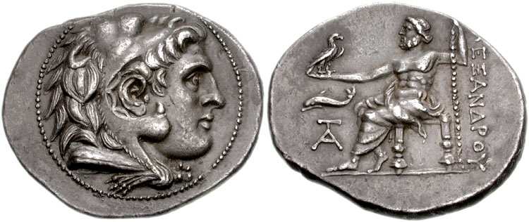 | SC 926a Price 3236 | Seleukid Kingdom of Syria, Seleukos III Soter (Keraunos) AR Tetradrachm in the name of Alexander the Great. Laodicea ad Mare(?) mint, ca 225 BC. Head of Herakles right, wearing lionskin headdress. / AΛEXANΔΡOY, Zeus seated left, right foot drawn back, holding eagle and sceptre. dolphin above TA monogram in left field. SC 926a, Price 3236. | Text | Image |
