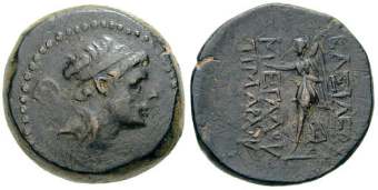 | Houghton 1234 | Timarchos, Usurper in Babylon, AE 29mm. 162 BC, Babylon mint. Diademed head of Timarchos right / BAΣIΛEΩΣ MEΓAΛOY TIMAΡXOY, Nike walking left, holding wreath and palm. Houghton CSE 1234, SNG Cop 249. | Text | Image |